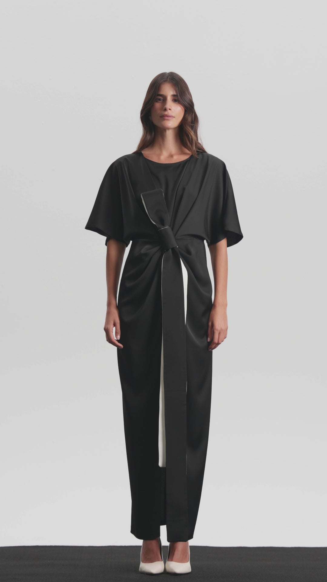 Bowie elbise, drapeli formu ve yuvarlak hatlı kol tasarımıyla her beden tipine uygun bir kalıp. Öndeki çift renkli fiyonk detayı bu elbiseye romantik bir karakter katıyor.