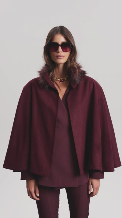 Merlot blazer, V yakası ve kruvaze formuyla modern bir güç silueti yaratır. Geniş yapılı omuz hattı trend ve modern bir görünüm yaratırken, omuzları geniş de gösterir.